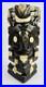 Brand: Unbranded hand-carved piece. Item: Vintage African tribal-style standing woman sculpture carved from dark hardwood with elongated neck rings and large pierced earrings. The figure holds a bottle or gourd at her side and stands barefoot on a natural tree-trunk slice base. Color: Dark brown to nearly black carved wood with lighter unfinished wood visible […]
