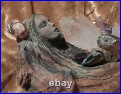 Ooak one of a kind original sculpture by SHAPING SPIRIT, Debra Bernier. Driftwood, goddess face, crystals. Quartz, smoky quartz, orange calcite, rough lapis? Approximately 6″ x 4″. See photos for reference. SHAPING SPIRIT presents an exquisite, one-of-a-kind sculpture art alter crafted by the talented Debra Bernier. This original piece embodies the essence of nature, art, inspiration, astrology, religion, and fantasy. It features a captivating blend of clay, crystals, and wood, sculpted with intricate detail and artistry. The sculpture serves as a powerful spiritual and healing piece, portraying women, fairies, goddesses, and other mystical figures. It is a perfect addition to any urban art, figurative art, art deco, or art nouveau collection. This ORIGINAL carving and sculpting creation is a unique, handcrafted masterpiece that promises to bring beauty and spirituality to any space. Smoke free home, one BIG cat. Properly packed and boxed. Depends on what works best with or schedule/situation/size? Twenty plus years as a Collector. Each, including but not limited to : artist dolls, ooak art, limited editions, vintage dolls/jewlry/misc, antique items, handmade hodgepodge of unique and weird. ? Vintage, antique, and estate items have history and come from a plethora of unkown environments. NOTE: Those with ALLERGY sensitivities, please be aware, these are porous objects. ? The A Family.