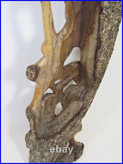 Vintage African Wood Carving Signed Wilson Tribal Couple Relief Sculpture 19. Bold and expressive, this hand-carved African sculpture features a striking relief of a tribal couple in motion, carved from a single piece of hardwood. The detailed work is signed “Wilson” on the back and retains much of its natural bark, adding texture and rustic charm to the piece. Unmarked by region but likely East African, this piece has a wonderful presence and is full of energy and symbolism. 19″ H x 6.5″ W x 2.5 D Weighs 3 lbs 13 oz.